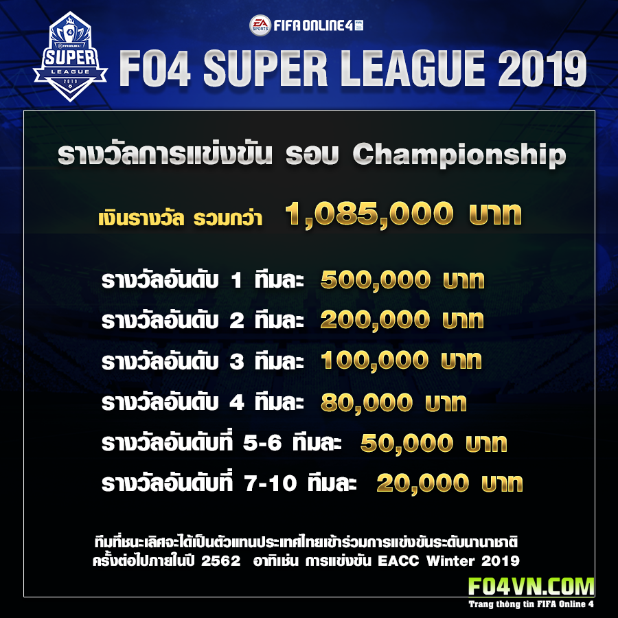 Giải đấu lần này, Mức tổng giá trị tiền thưởng là 1,000,000 Bath ( Khoảng hơn 730 triệu VND ) . Một con số rất lớn và chưa từng có tại các giải FIFA Online 4 của Thái Lan trước đây.