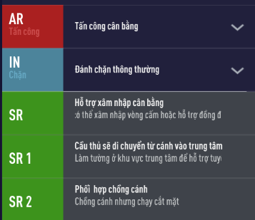 Việc SR 1 để cầu thủ hậu vệ cánh di chuyển vào trung tâm để hỗ trợ tuyến giữa đa phần sẽ không được nhiều người ưa thích lắm vì điều này sẽ làm xáo trộn đội hình, gây hổng cánh rất nhiều, nhưng nó lại khá phù hợp với sơ đồ nếu bạn sử dụng LWB, RWB hay ý đồ chiến thuật một cách rõ ràng mà chúng tôi sẽ nói ở phần sau.