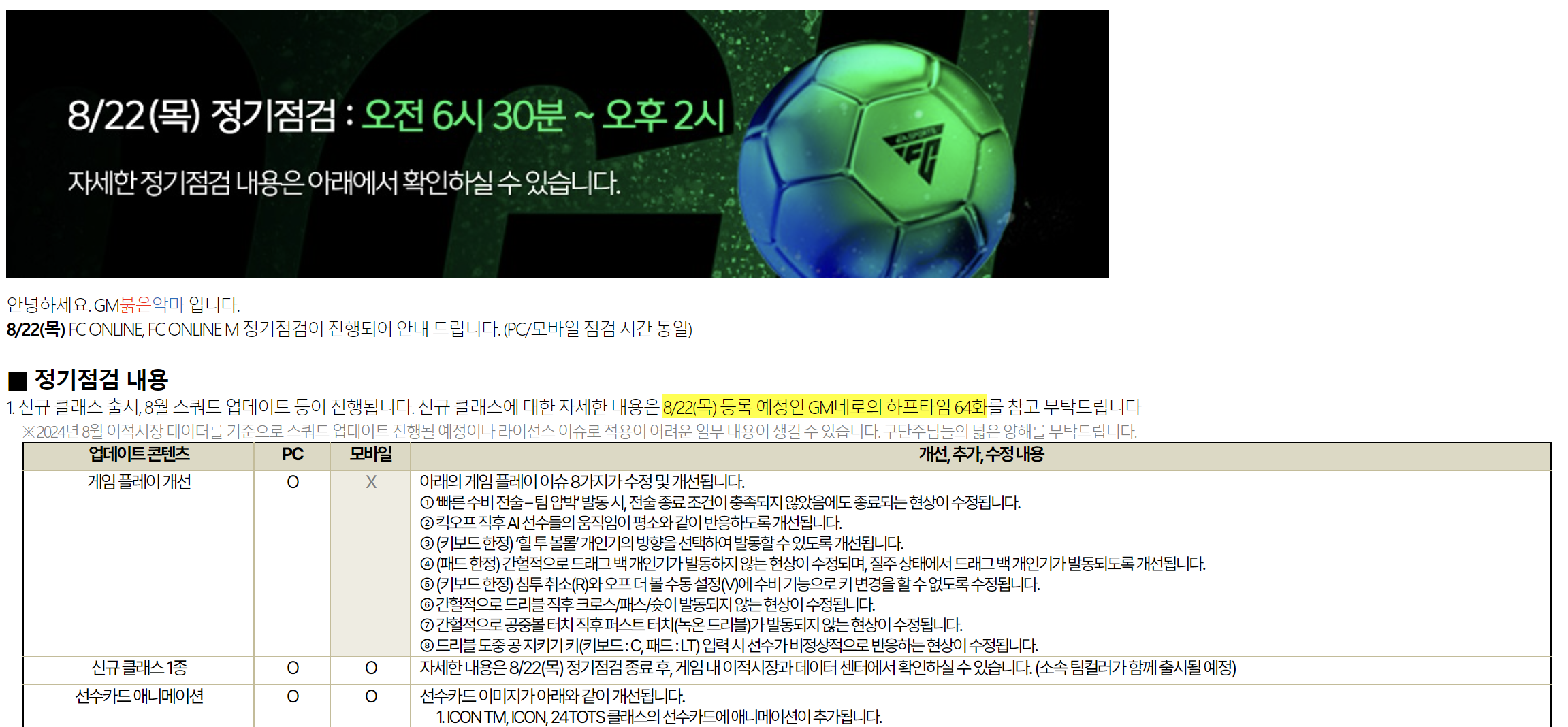 Cụ thể chi tiết về thông tin cập nhật được Gamemaster Quỷ Đỏ đưa ra phía dưới đây sẽ là thông tin cập nhật chính thức cho FC Online Hàn Quốc vào ngày 22/8/2024.