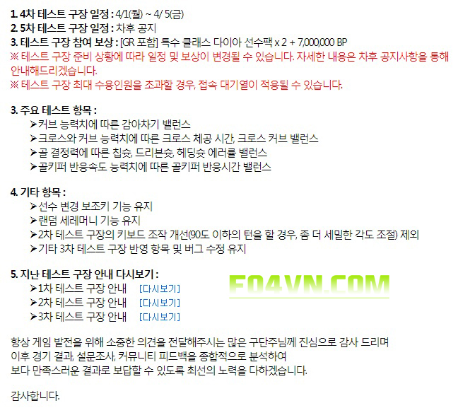 - Đánh giá các mục thử nghiệm xem trực tiếp tại trang chủ FO4 Hàn Quốc.