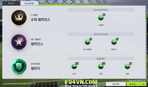 Ở thứ hạng Champions, người chơi sẽ đạt được nếu đứng thứ hạng từ 1000 đến 101 trong tổng số người chơi game FIFA Online 4. Còn ở thứ hạng Super Champions, thứ hạng yêu cầu sẽ là top 100 người chơi rank có điểm cao nhất.