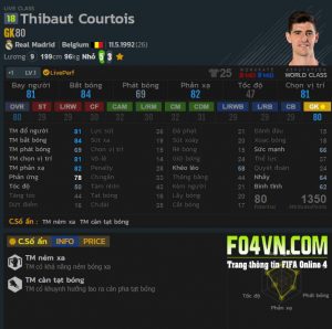 Rất may là De Gea, Neuer đều có mức lương trên 10. Nên Courtois trở thành thủ thành được chọn lựa nhiều nhất tại máy chủ Hàn Quốc. Tuy nhiên lương chỉ là một phần. Thực sự " Củ tỏi " bắt rất ổn, và có bộ chỉ số ẩn cũng rất hợp meta game. Điểm yếu chết người của thủ thành người Bỉ là hay có những tình huống vồ ếch hay để thủng lưỡi những bàn thắng ngớ ngẩn. Đôi khi chỉ là một pha chuyền về. Đây mới chính là Van Der Sar của Fo3. Chuyên gia ói bóng ra vạch 5m để đối phương đá bồi. Tuy nhiên nếu tính tiêu chí chống được cú đại bác đầu tiên thì củ tỏi làm xuất sắc. Mỗi tội lương hơn cao so với 6 cái tên kể trên.
