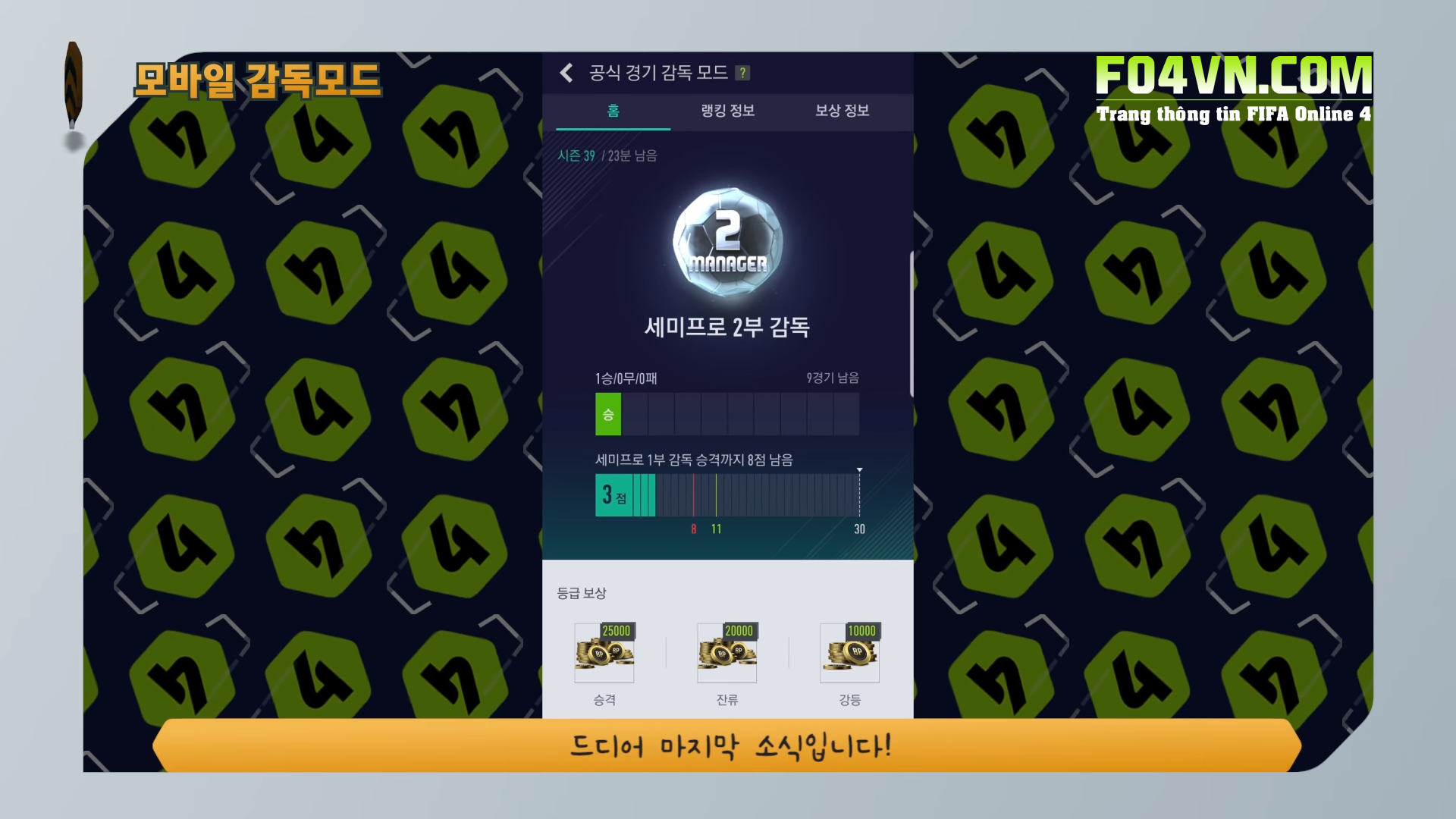 Bảng thưởng xếp hạng 1vs1Ra mắt tính năng GLXH trên Mobile Lần cập nhật này, FIFA Online 4 Hàn Quốc còn đưa ra thêm tính năng mới đó là tính năng GLXH trên Mobile. Với tính năng này, người chơi sẽ thiết lập đội hình trực tiếp trên phiên bản Mobile sau đó tham gia chế độ GLXH và thi đấu Rank xếp hạng riêng. Rank xếp hạng trên điện thoại vẫn sẽ được nhận thưởng như rank GLXH trên PC.