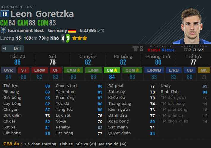 Việc giảm chỉ số của Goretzka 17 khiến anh chàng này không còn được nhiều sự kì vọng như trước, tuy nhiên thẻ mùa giải TB của Goretzka thực sự vô cùng xuất sắc. Khả năng chuyền bóng tốt, di chuyển thông minh và luôn tự có xu hướng lùi về tham gia phòng ngự ngay cả khi không điều chỉnh khiến anh rất được tin dùng trong game.