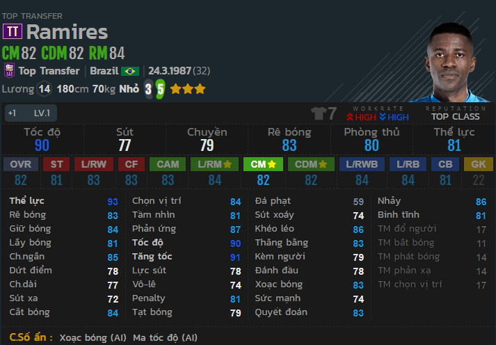 Với những người chơi hứng thú với mẫu tiền vệ phòng ngự tốc độ cao thì Ramires chính là quân bài không thể bỏ qua. Với mức giá tương đối phải chăng để sở hữu một máy chạy tia chớp ngay trên sân. Thực sự là đáng để lựa chọn tới từ người chơi.