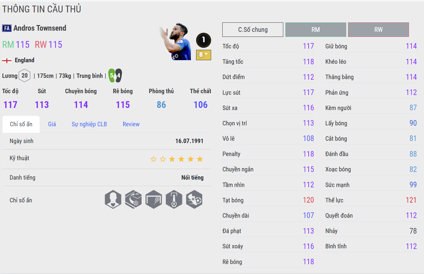 Cầu thủ người Anh bất ngờ nổi lên như một hiện tượng khi mùa thẻ FA +8 được xả nhiều ở FC Online của máy chủ Việt Nam lẫn của Hàn Quốc. Anh cho thấy giá trị rõ nét và được xem là một cái tên giá rẻ cộng cao đáng dùng ở mùa thẻ FA.
