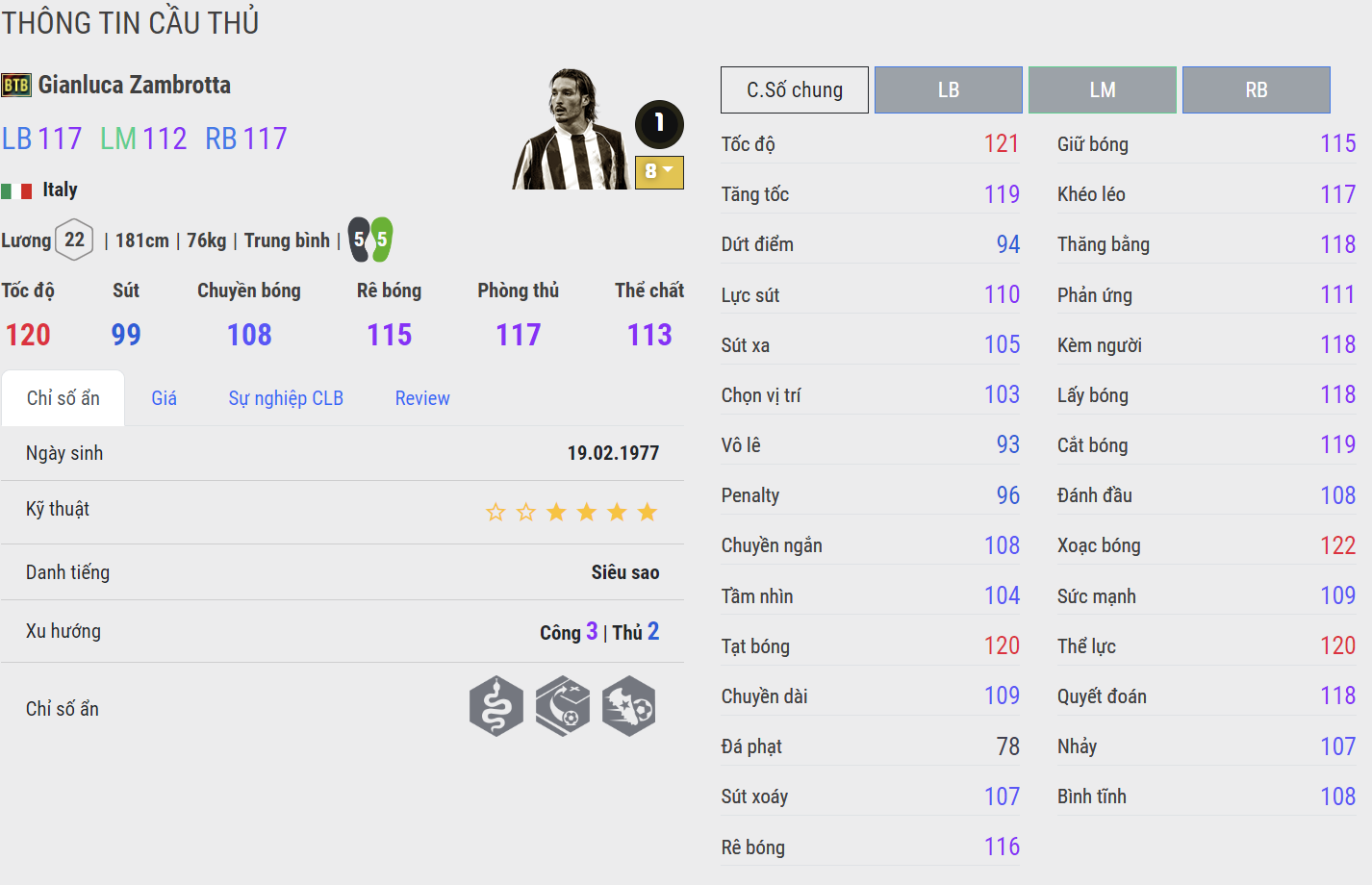 AI di chuyển cắt bóng phòng ngự cảu Zambrotta rất hay. Cầu thủ người Ý di chuyển rất khôn, luôn đứng ở những vị trí thuận lợi khi phòng ngự và che sườn rất tốt, ít khi dâng quá cao hay bó quá sâu vào trung lộ để hổng vị trí. Khả năng tắc bóng tốt cùng kỹ năng xoạc rất khó chịu với tỉ lệ chính xác cao và ít xảy ra lỗi hay phải nhận thẻ.