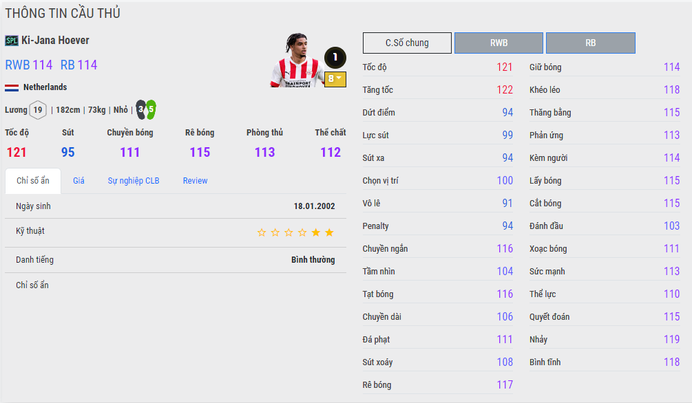 Không có chỉ số ẩn nào cả nhưng thực chiến của cầu thủ này trong game có thể khiến bạn bất ngờ, bởi khả năng cắt bóng của Ki-Jana Hoever là rất tốt, hoàn toàn không hề thua kém gì Trent Alexander Arnold cả. Tốc độ của Ki-Jana Hoever cũng được thể hiện rất tốt với mức thẻ cộng 8. Điều này có được là nhờ sải chân dài và thể hình gầy, giúp cho khi tăng tốc bạn sẽ thấy Ki-Jana Hoever đạt tốc độ cao rất nhanh, đeo bám vô cùng nhiệt bất cứ tiền vệ, tiền đạo cánh nào của đối phương.