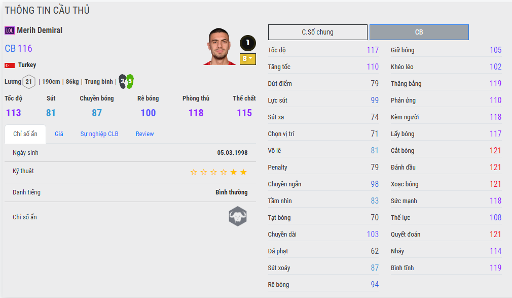 Trong FC Online khá ít người để ý đến trung vệ này, tuy nhiên khi mà nhìn vào chiều cao, cân nặng và bộ chỉ số của Merih Demiral mùa LOL thì có lẽ bạn nên thay đổi cái nhìn về trung vệ này.