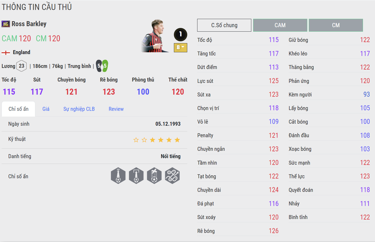 Phiên bản +8 là một trong những phiên bản nâng cấp chất lượng của tiền vệ người Anh. Anh cho thấy nhiều điểm ấn tượng và đang là cái tên rất được tin dùng cho meta hiện tại. Sở hữu tốc độ khá ổn, dù không quá nhanh nhưng Ross Barkley cũng đem đến hiệu quả di chuyển tốt.