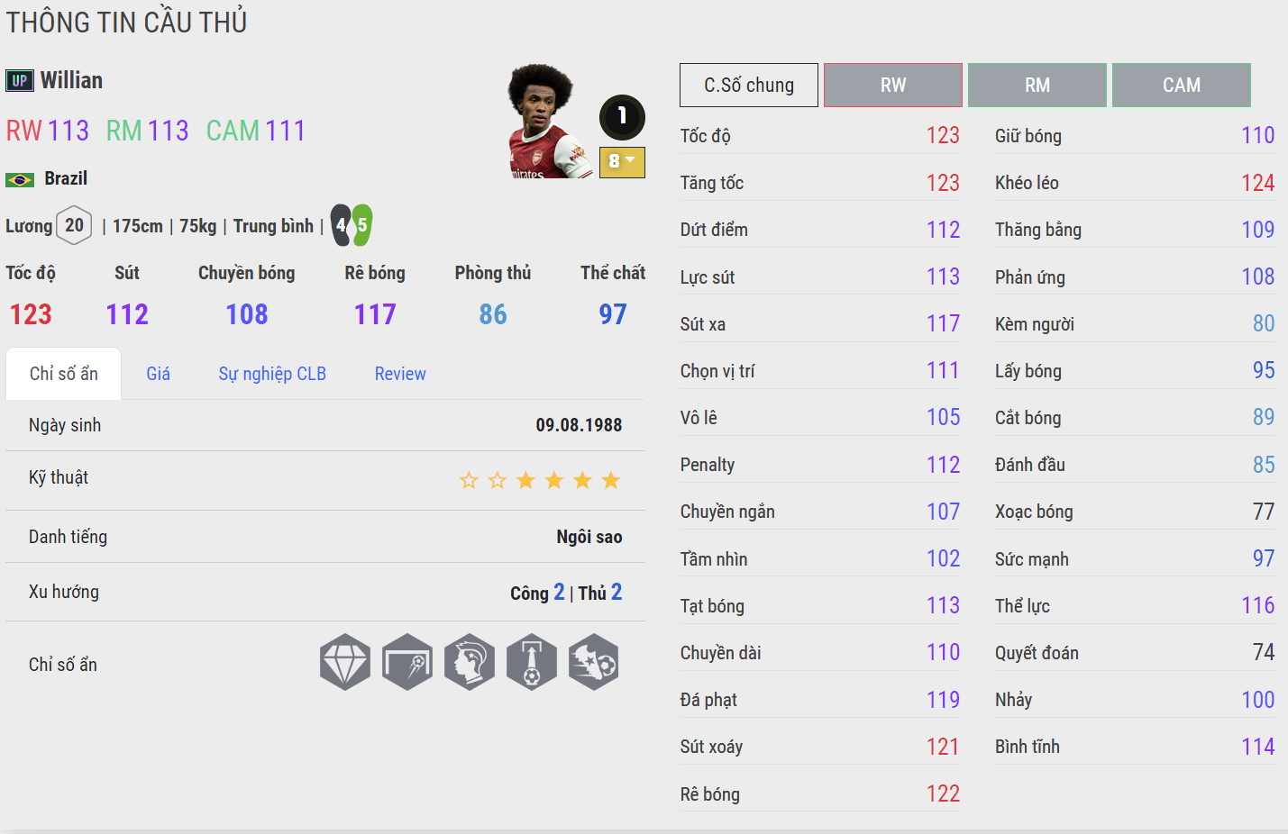 Đây được xem là một trong những phiên bản chạy cánh rất đáng quan tâm của tiền vệ người Brazil. Willian phiên bản Up +8 có đầy đủ những yếu tố của một tiền vệ chạy cánh hàng đầu của meta game FC Online.