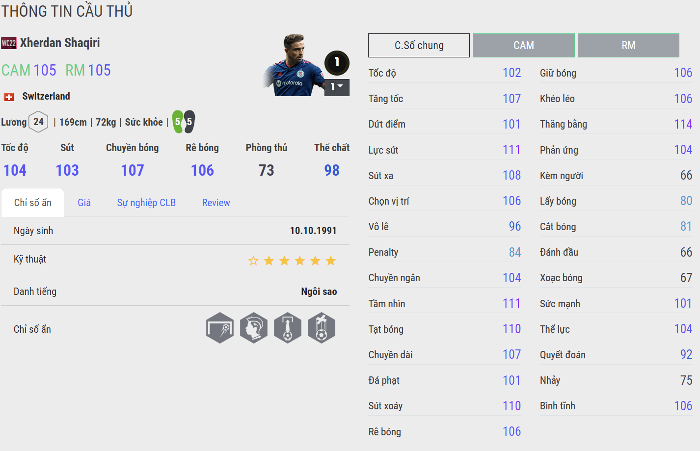 Khả năng sút bóng của Shaqiri là rất tốt, cầu thủ người Thụy Sĩ có thể sút tốt bằng cả 2 chân ở trong lẫn ngoài vòng cấm đều hiệu quả. Đặc biệt là khả năng sút xa lực bóng căng, đường bóng đi hiểm và thậm chí Shaqiri còn có thể sút xa tốt ở nhiều góc khó. Khả năng ZD của Shaqiri cũng rất hiệu quả và đem đến lợi thế sử dụng ổn định.