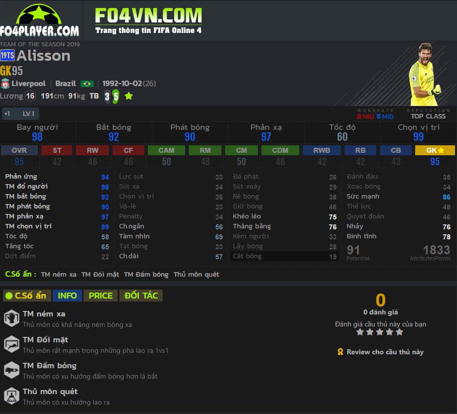 Mùa giải 19TS mô tả một Alisson thực sự khác biệt và toàn diện nơi khung gỗ. Vậy anh thể hiện trong game ra sao? Hãy cùng FO4VN.COM tìm hiểu ở bài viết dưới đây.
