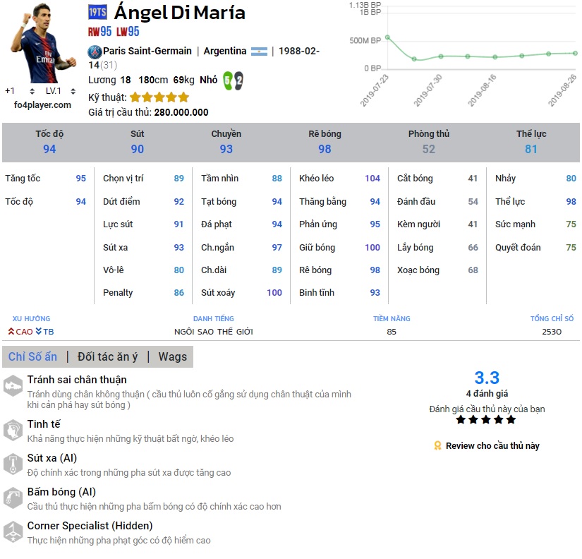 Chỉ số của Di Maria | Nguồn : FO4PLAYER.COMChấm điểm : 8,8/10