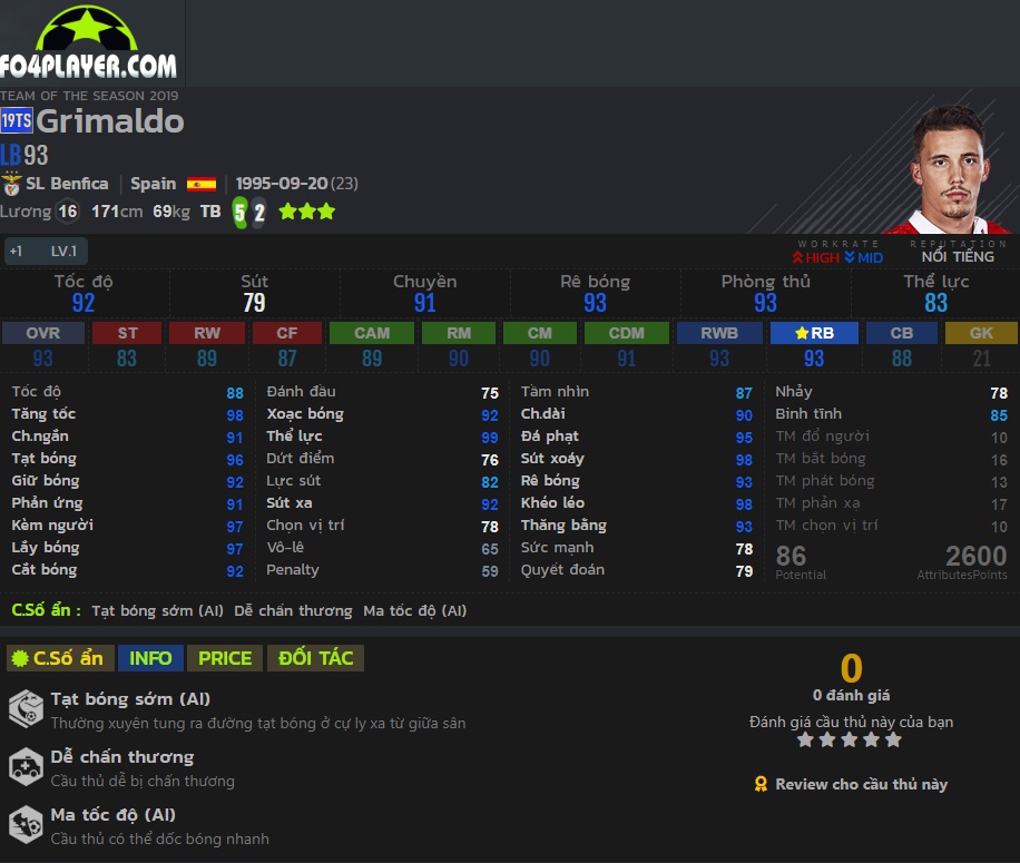 - Tạt bóng : Grimaldo tạt bóng rất ảo, bóng bay rất chính xác và có độ xoáy cao. Nếu rơi vào tay những game thủ có kỹ năng đá tạt bóng tốt thì anh hoàn toàn có thể là một vị trí hỗ trợ tấn công nguy hiểm và hiệu quả.