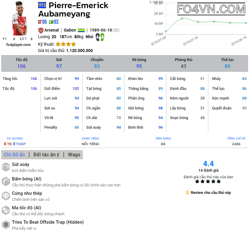 - Dứt điểm : Với việc trở thành vua phá lưới của giải NHA, không quá khó hiểu khi Nexon buff khả năng sút của Auba lên một mức mới hoàn toàn khác biệt. Auba 19TS dứt điểm cực kì khét và gần như rất ít có cơ hội cho các thủ môn. Lực sút tốt cũng khiến cho những pha dứt điểm càng thêm khó bắt.