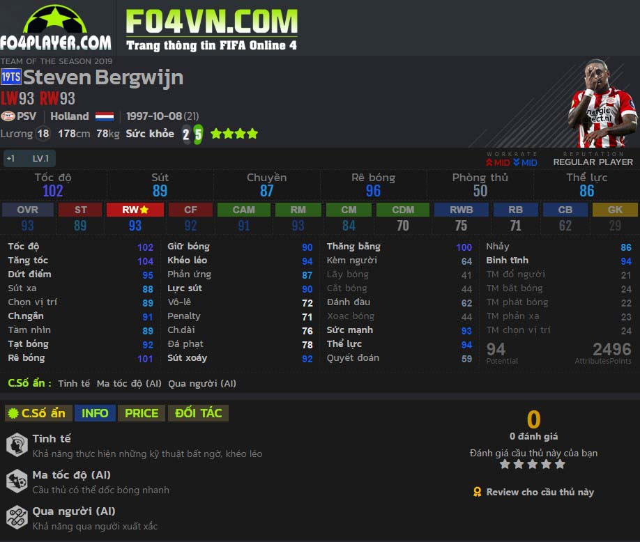 Vị trí của Bergwijn nên là tiền vệ hoặc tiền đạo cánh phải. Nơi phát huy tốt khả năng dốc bóng, tạt bóng cũng như hỗ trợ tấn công từ hành lang biên của anh. Đánh giá : 8,6 điểm Video đánh giá Bergwijn trong game https://www.youtube.com/watch?time_continue=174&v=CCrhICgN1mM