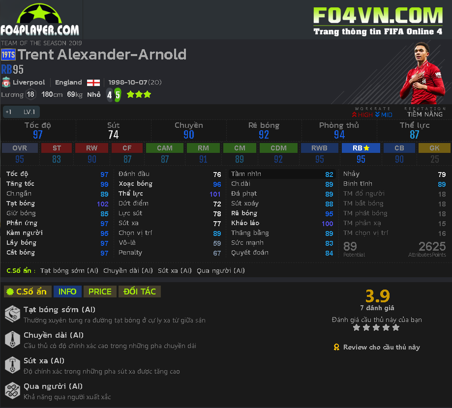 Trong game, Alexander-Arnold 19TS thể hiện rất toàn diện.Anh xứng đáng với giá tiền mà bỏ ra để mua nhưng lương là một vấn đề lớn dành cho anh, nhiều người không dám đổi 19 lương trong đội hình cho vị trí RB vậy nếu không phải là fan hâm mộ thì họ cũng sẽ không mua anh về.Trong đội hình, ngoài RB thì bạn có thể đặt Alexander-Arnold ở CDM.Ở vị trí này, anh thể hiện rất tốt: phòng ngự tốt,chuyền bóng tốt,tấn công ổn và thể lực rất tốt, một con hàng rất đa năng và dễ chơi,dễ trúng thưởng chắc chắn sẽ là một lựa chọn xứng đáng dành cho bạn.