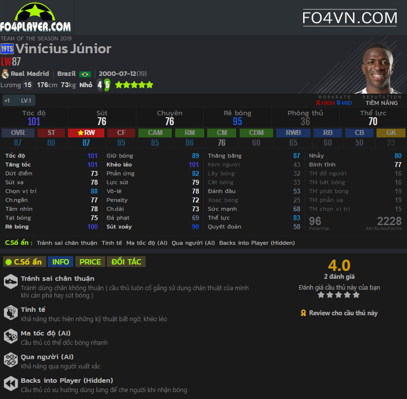 - Tốc độ : Không còn quá xa lạ khi nói về tốc độ của cầu thủ này với những ai từng sử dụng mùa GR. Vinicius di chuyển rất nhanh mà một khi đã thoát xuống thì cực kì khó bị bắt kịp.