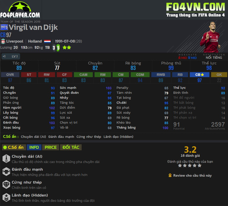 - Không chiến : Thêm cho mình chỉ số ẩn đánh đầu mạnh khiến Van Dijk càng trở nên nguy hiểm trong những pha không chiến . Đặc biệt là khi khả năng tranh chấp tay đôi trên không của anh là cực kì tuyệt vời. Lực đánh đầu cũng mạnh và chính xác hơn.