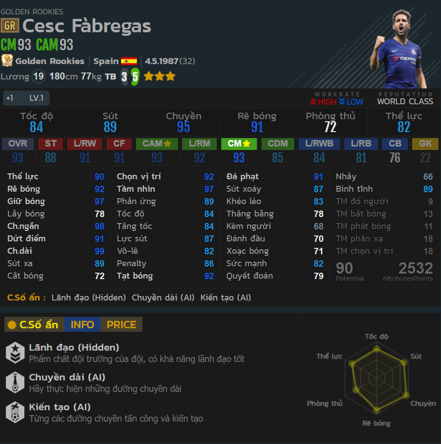 Cesc Fabregas, cậu bé vàng năm 2006 là một hiện tượng của clb Arsenal. Anh thi đấu xuất sắc và giúp CLB vào tới chung kết C1. Trận đấu đó Arsenal đã để thua Barcelona. Fabregas trong game là một dạng tiền vệ điều phối bóng dạng như những Xavi ,Iniesta , Modric... Với những ai thích build team Arsenal, Barca hay Chelsea cần một tiền vệ điều phối bóng thì Fabregas là một cái tên không thể bỏ qua.