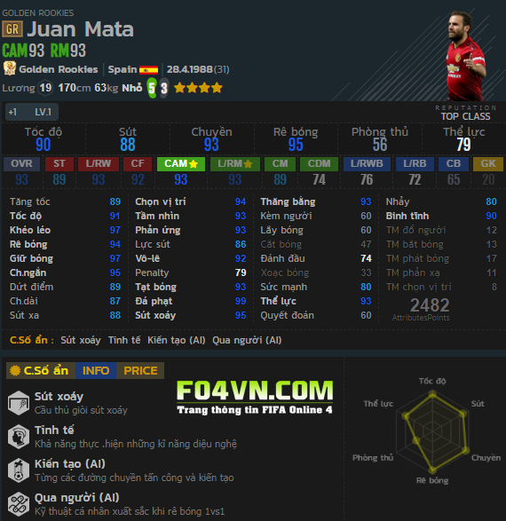OVR của Mata là 93 ở lv1, khá cao so với mặt bằng chung hiện tại của FIFA Online 4 ( Không tính mùa TOTY và ICON). Mata cao 1m70 nặng 63kg và có thể hình nhỏ. Điều này khiến anh chỉ phù hợp với những người chơi thích sử dụng tiền vệ tấn công dạng nhỏ con, nhanh nhẹn và khéo léo.