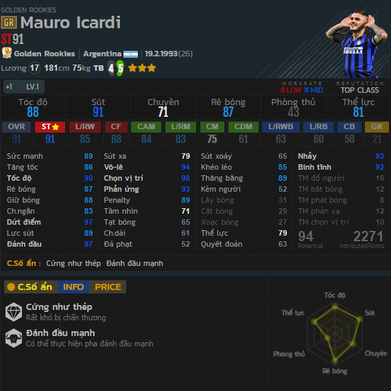 - Tốc độ : Không nhanh như trên thẻ, cầm bóng đẩy tốc khá tù. Vì ngoài đời Icardi rất ít khi cầm bóng đua tốc với các hậu vệ đối phương.