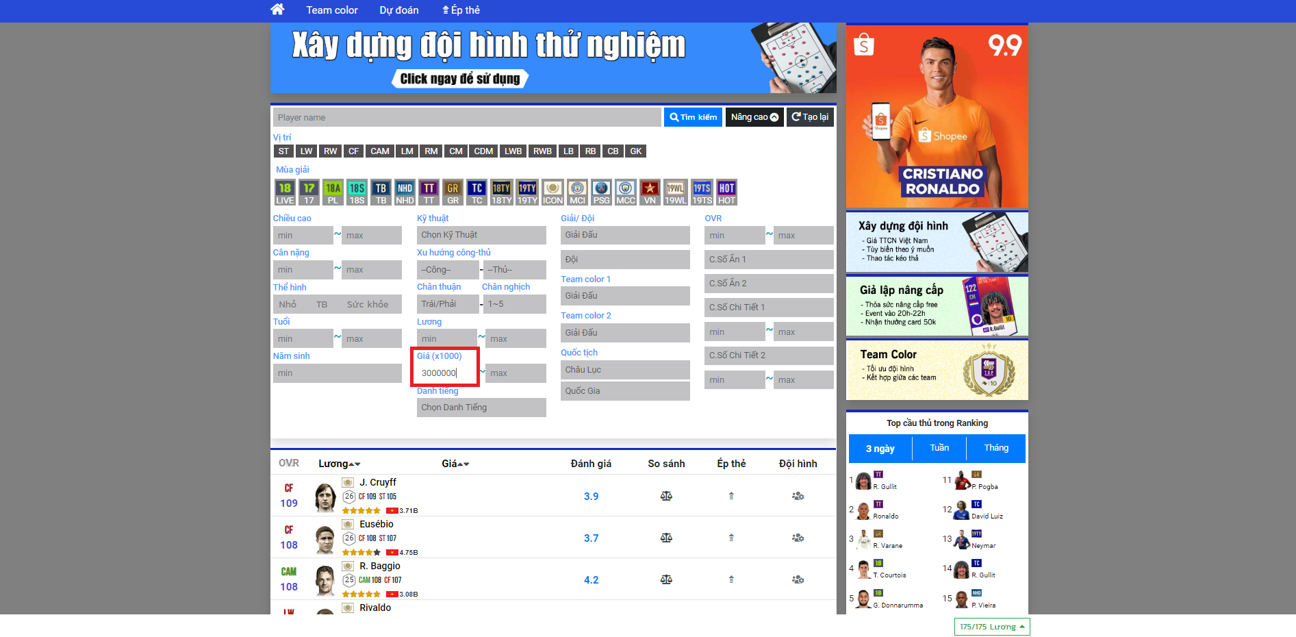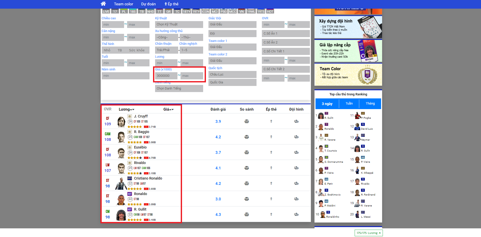 Sau khi lựa chọn mức giá phù hợp, phía dưới sẽ hiện ra những cầu thủ có giá trị tương đương mức giá mà bạn yêu cầu.