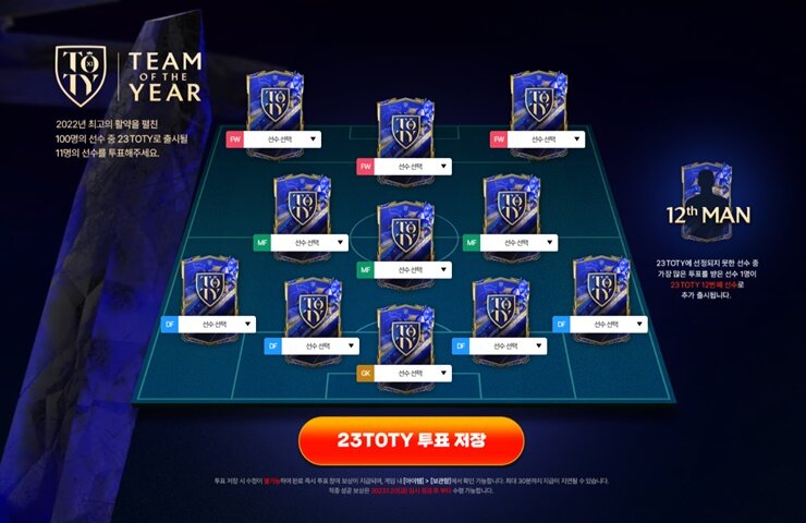 Việc bình chọn 11 cầu thủ 23TOTY vẫn được tiến hành ở các sever, tuy nhiên như mọi năm thì danh sách 11 cầu thủ bình chọn này có lẽ chỉ mang tính tượng trưng, cầu thủ 12 của mỗi sever sẽ khác nhau tùy vào lượt bình chọn của các sever.