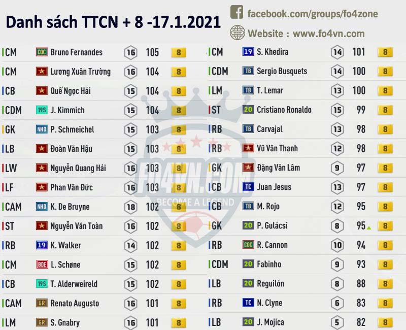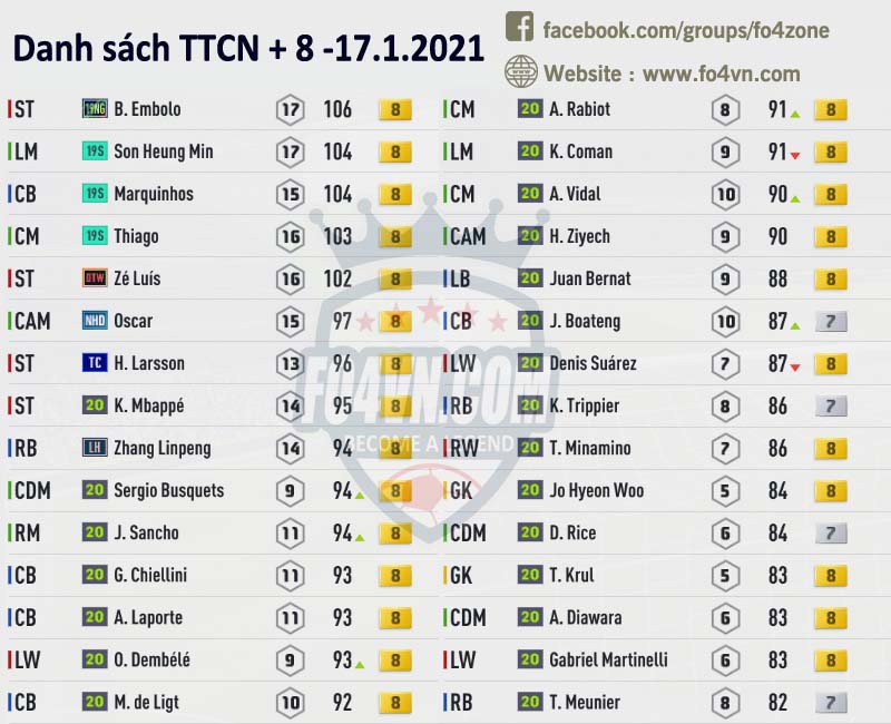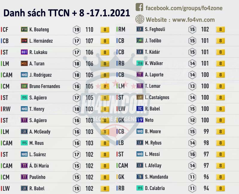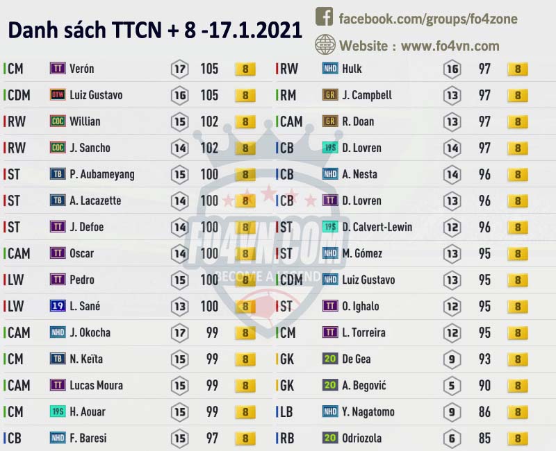 Fo4vn xin được tổng hợp tất cả những cầu thủ đang được các HLV rao bán trên group của chúng tôi ( https://www.facebook.com/groups/fo4zone ). Danh sách này sẽ được update liên tục trong ngày, hi vọng nó sẽ có thể giúp các bạn có được cầu thủ cần tìm.
