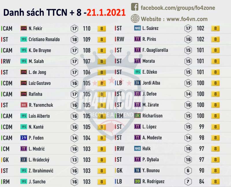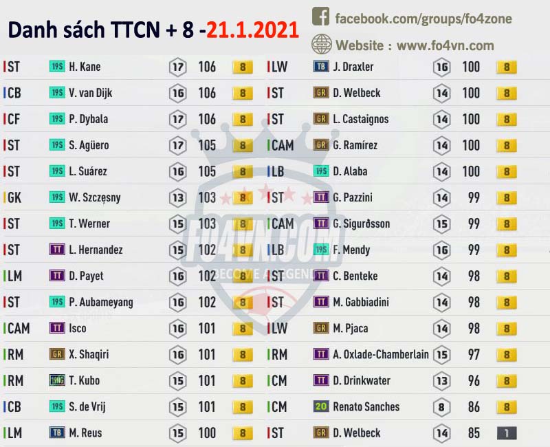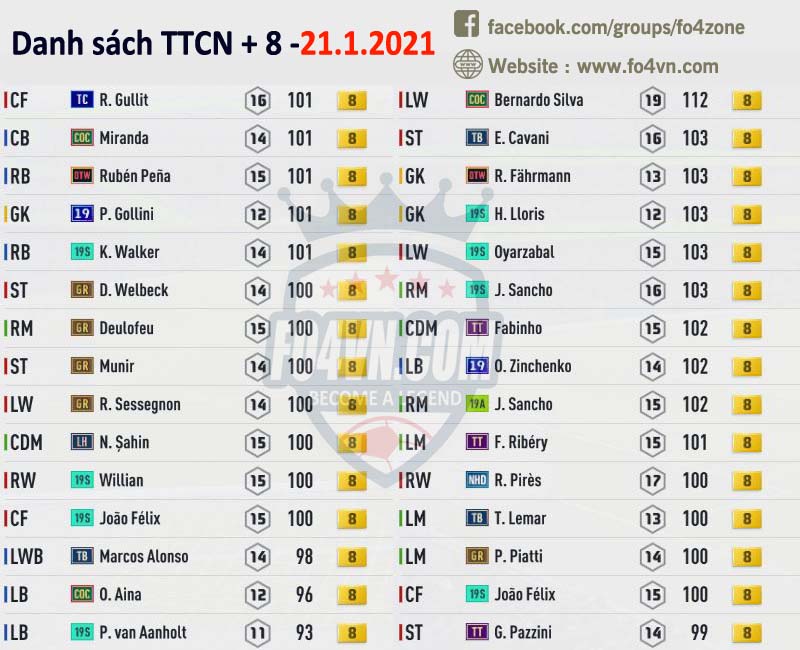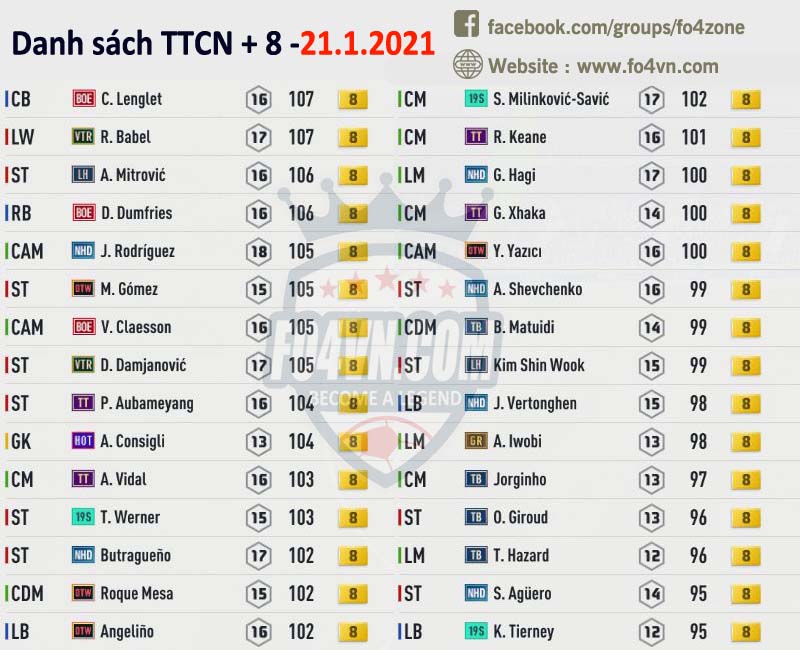 Fo4vn xin được tổng hợp tất cả những cầu thủ đang được các HLV rao bán trên group của chúng tôi ( https://www.facebook.com/groups/fo4zone ). Danh sách này sẽ được update liên tục trong ngày, hi vọng nó sẽ có thể giúp các bạn có được cầu thủ cần tìm.