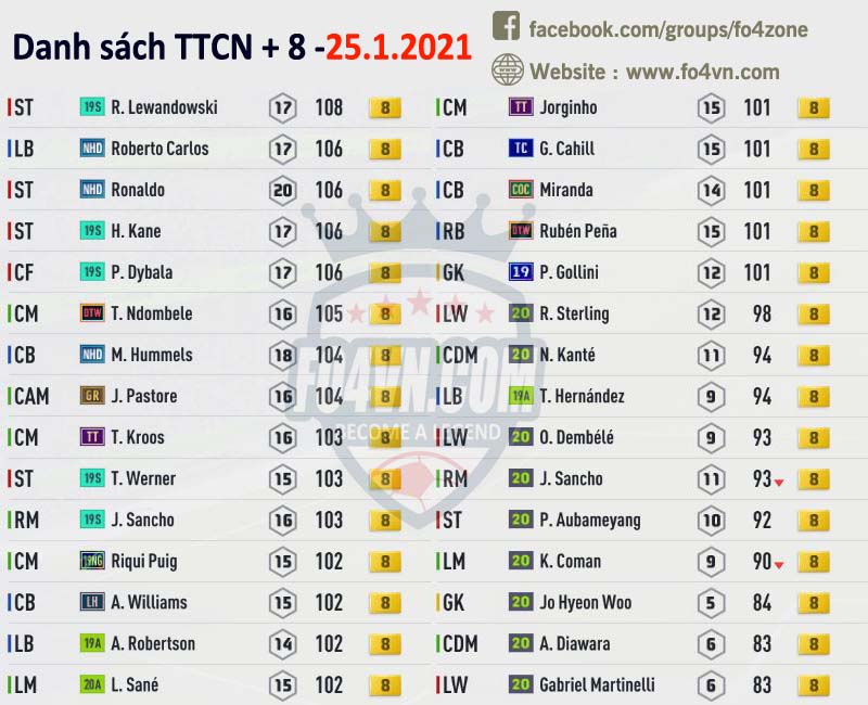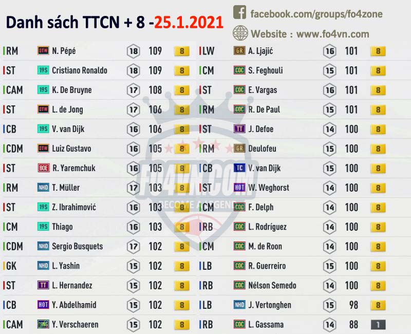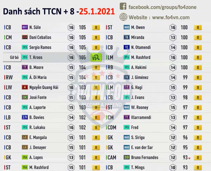 Fo4vn xin được tổng hợp tất cả những cầu thủ đang được các HLV rao bán trên group của chúng tôi ( https://www.facebook.com/groups/fo4zone ). Danh sách này sẽ được update liên tục trong ngày, hi vọng nó sẽ có thể giúp các bạn có được cầu thủ cần tìm.