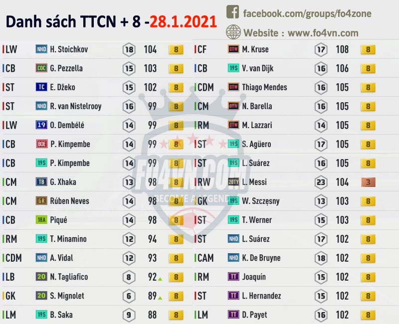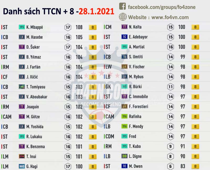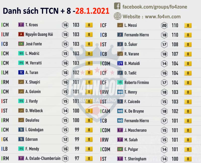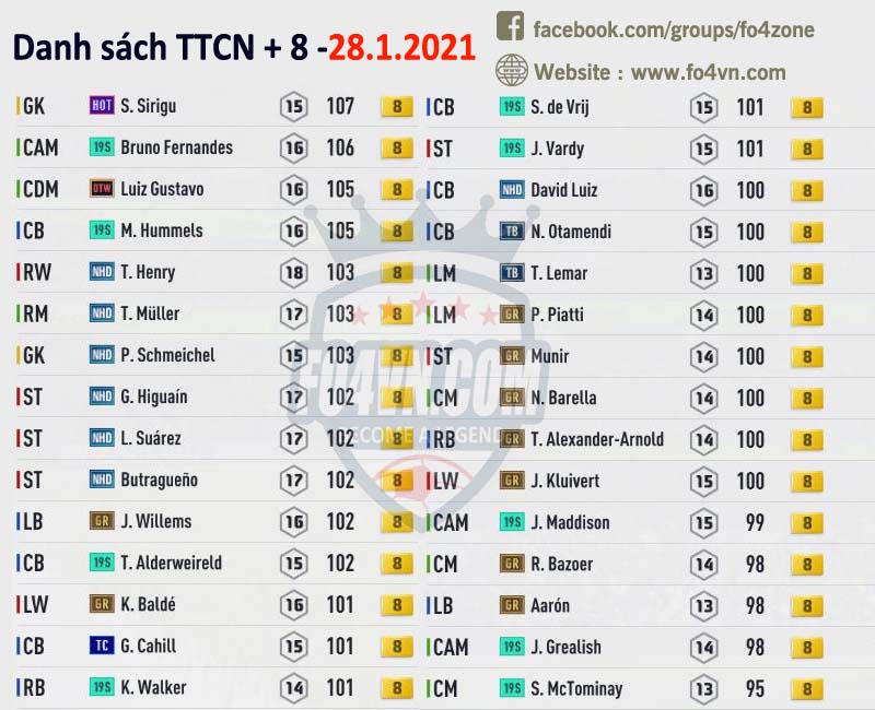 Fo4vn xin được tổng hợp tất cả những cầu thủ đang được các HLV rao bán trên group của chúng tôi ( https://www.facebook.com/groups/fo4zone ). Danh sách này sẽ được update liên tục trong ngày, hi vọng nó sẽ có thể giúp các bạn có được cầu thủ cần tìm.