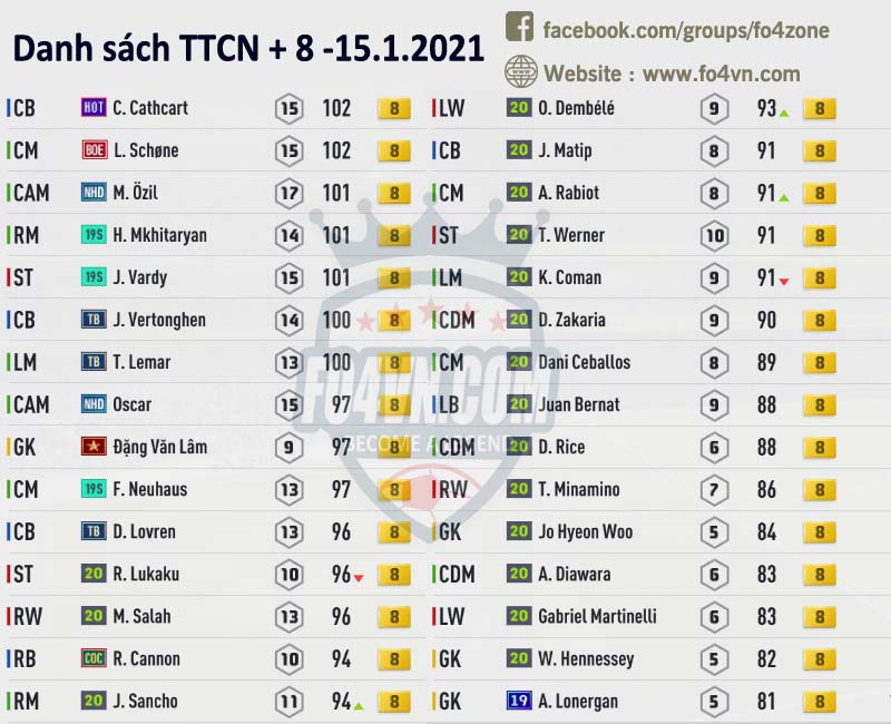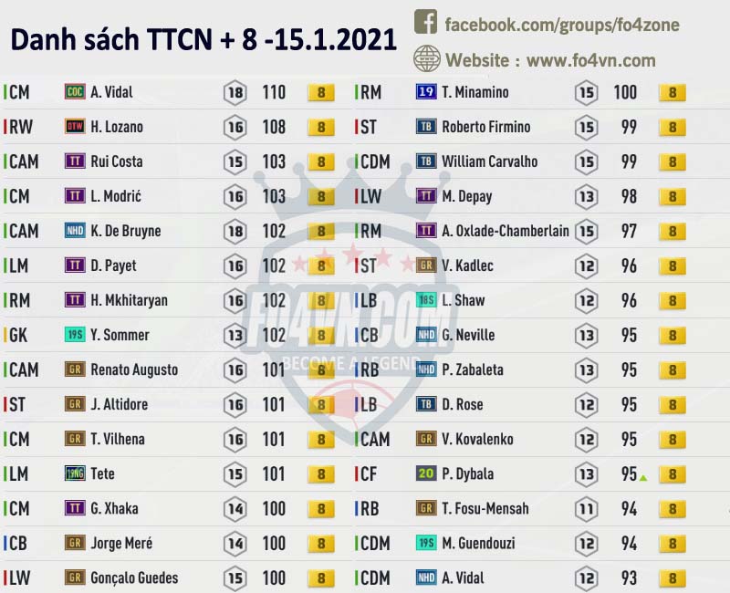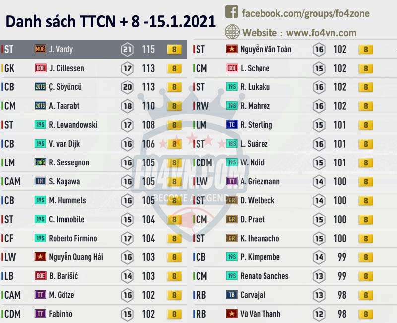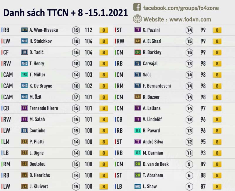 Nhằm tạo điều kiện cho các bạn độc giả săn hàng +8 trên TTCN và có thể tìm được những HLV đang có nhu cầu thanh lý hàng +8. Fo4vn xin được tổng hợp tất cả những cầu thủ đang được rao bán trên group của chúng tôi ( https://www.facebook.com/groups/fo4zone ). Danh sách này sẽ được update liên tục trong ngày, hi vọng nó sẽ có thể giúp các bạn có được cầu thủ cần tìm.