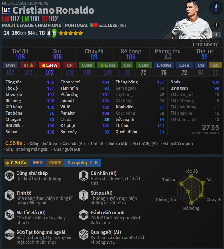 Siêu sao người Bồ Đào Nha là cầu thủ toàn diện trên hàng công, từ chạy chỗ, kỹ thuật, tốc độ, không chiến, đến tỳ đè. Nếu để chọn ra cầu thủ dễ sử dụng nhất game thì đó chính số 7 huyền thoại này. Bất cứ phiên bản nào thì Cr7 vẫn là cái tên cực khó chịu với mọi hàng hậu vệ.