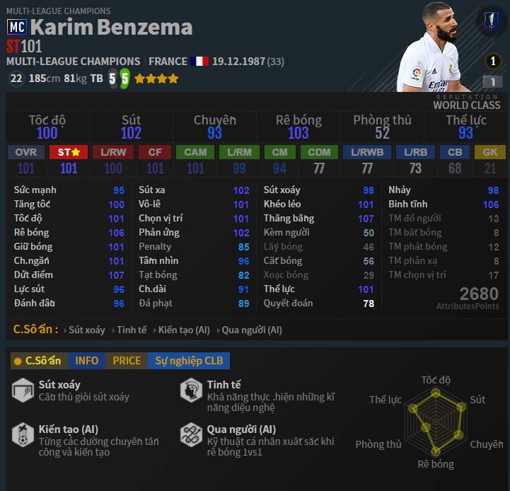 Không nổi bật bởi tốc độ hay tỳ đè, Benzema có cho mình khả năng chạy chỗ cực hay, việc bạn cần làm chỉ là chuyền chọc cho chuẩn khi benzema di chuyển. Tiền đạo thuộc biên chế Real dường như bị lãng quên ở FO4. mà nhiều người đã quên mất anh từng là một sát thủ chạy chỗ ở Fo3. Chưa kể Ben ú lại là một cầu thủ có khả năng ban bật cực tốt với các đồng đội