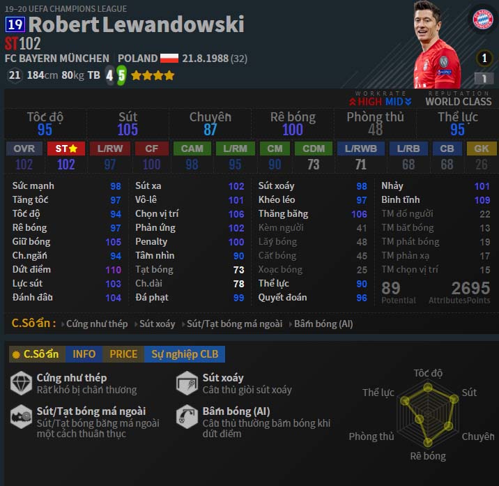 Nhà vô địch C1 mùa giải 2019-2020 là cái tên kén người dùng trong game, bởi khả năng xoay sở kém và có phần hơi chậm. Nhưng điểm mạnh của anh là di chuyển không bóng. Giờ đây khi việc tối ưu hóa đường chuyền của các tiền vệ, bạn sẽ thấy Lewandowski nguy hiểm thế nào. Khi mà anh có cơ hội để phát huy sở trường của mình. Tuy nhiên mùa giải đề xuất cho tiền đạo Ba Lan đến lúc này vẫn là 19ULC thay vì MC
