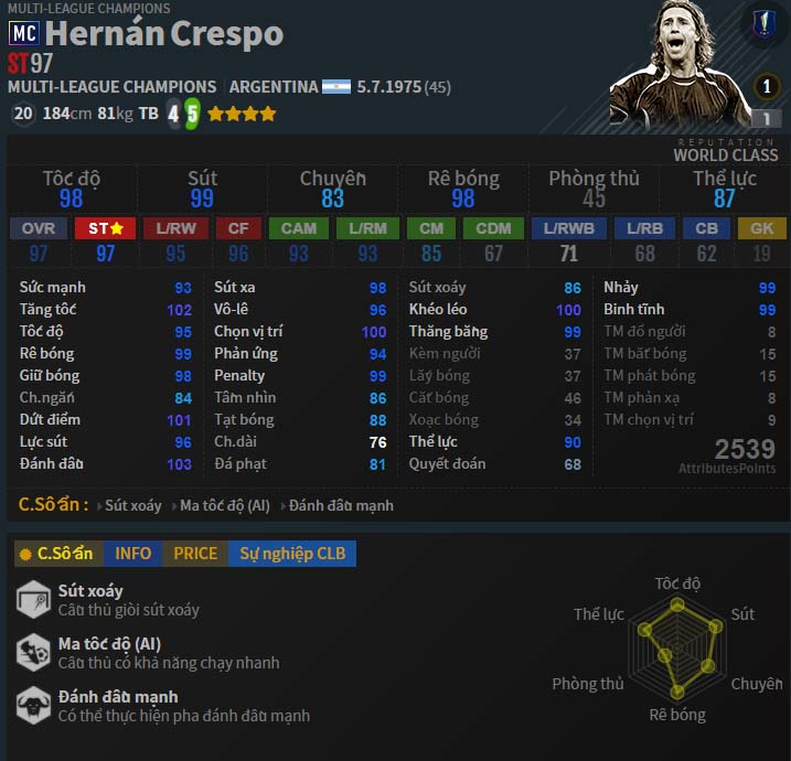 Tiền đạo người Argentina là chủ công của rất nhiều game thủ FO4 đời đầu đến giờ, phải nói rằng FO4 đã nâng tầm Crespo rất nhiều so với FO3. Khi mà anh có tốc độ, lỳ đòn, không chiến, tuy nhiên khả năng chạy chỗ của Crespo lại không được đánh giá cao. Dẫu sao anh cũng là cái tên toàn diện trong hàng tá các tiền đạo hiện tại, và hơn nữa giá của anh cũng rất dễ để sở hữu.