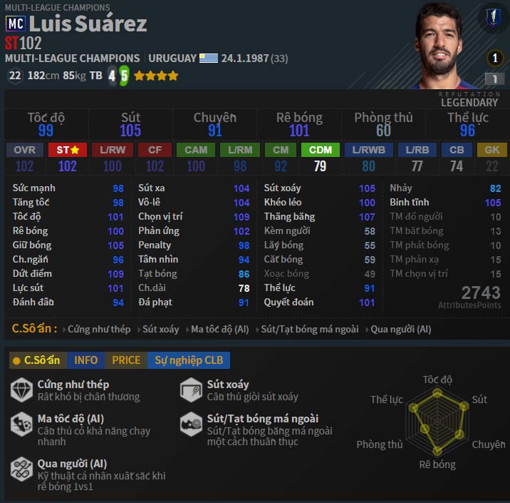 Tiền đạo người Uruguay tuy chơi lùi khá sâu về giữa sân để tham gia làm bóng cùng đồng đội, nhưng khả năng đánh hơi bàn thắng thì khỏi bàn, nếu bạn là một fan của Barca hay lối chơi ban ngắn, QS thì đây là một tiền đạo nên sở hữu trong đội hình, nên nhớ anh ấy không phải là mẫu tiền đạo mục tiêu như Ibra hay Drogba.