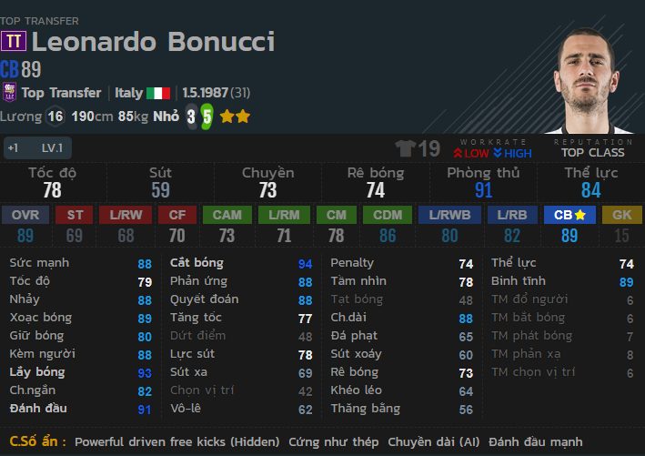 Thể hình nhỏ, tốc độ ổn khiến Bonucci tuy không quá mạnh về tì đè nhưng lại có thể thực hiện tốt việc bứt lên để xoạc bóng hoặc tắc bóng trong chân đối thủ. Khả năng xoạc bóng của Bonucci là khá tốt. Kỹ năng đánh đầu cũng rất ổn với chiều cao lý tưởng cũng như khả năng bật nhảy lên tới 88. Tuy nhiên cũng giống như Chiellini khả năng phản xạ và cản phá những pha bóng nguy hiểm là hơi phập phù.