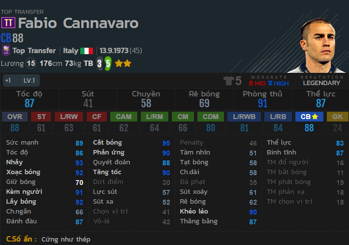 Tốc độ cực cao cùng với khả năng thăng bằng tốt và trọng tâm thấp khiến Cannavaro rất mạnh trong việc tì đè bứt tốc để tắc bóng. Khả năng xoạc bóng, đọc trận đấu để cắt đường chuyền của Cannavaro là rất tốt. Mặc dù có chỉ số đánh đầu tốt và khả năng bật nhảy rất ổn tuy nhiên Cannavaro với chiều cao thấp cho thấy sự thiếu ổn định trong không chiến. Điểm mạnh khác của Cannavaro là khả năng phản ứng với các tình huống nguy hiểm là rất tốt. Thường xuyên tự nhoài người xoạc bóng hoặc chặn những cú sút cũng như cản phá các cơ hội mười mươi của đối thủ.