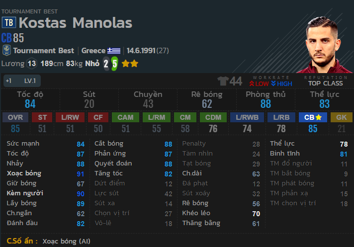Tốc độ của Manolas là khá tốt, mạnh trong những pha bám đuổi tì đè để cản phá bóng. Khả năng xoạc bóng của Manolas là khá tốt, những pha xoạc có độ chính xác cao, ít khi bị thổi phạt cho dù là xoạc bóng khi đang ở tư thế không thuận lợi. Không chiến của Manolas rất ổn với thể hình lý tưởng dù chỉ số đánh đầu không quá nổi trội. Khả năng phản ứng trong các tình huống nguy hiểm là tốt. Thường xoạc bóng để chặn các cú sút nếu đứng ở tư thế thuận lợi.