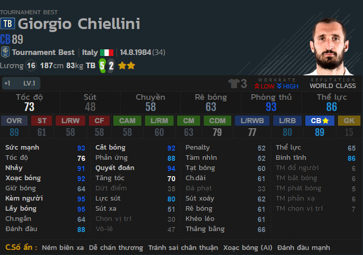 Tốc độ không quá nổi bật khiến Chiellini thực hiện không tốt và thiếu ổn định với những pha bứt tốc để cướp bóng với cầu thủ đối phương. Tuy nhiên khả năng tắc bóng cũng như xoạc bóng của Chiellini lại rất tốt. Khả năng so kè tông vai trực tiếp với các tiền đạo đối phương là tốt. Bật nhảy rất tốt cùng với khả năng đánh đầu tốt khiến Chiellini khá mạnh về không chiến. Tuy nhiên khả năng phản xạ để tự động xoạc bóng hoặc cứu thua các tình huống nguy hiểm là hơi phập phù, lúc tốt lúc lại rất tệ.