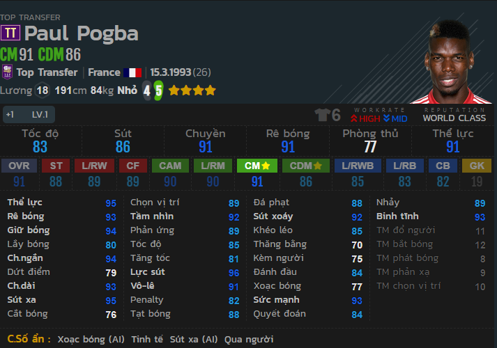 Một trong những cầu thủ khá mạnh ở vị trí tiền vệ trung tâm, Pogba sở hữu khả năng chuyền ngắn cũng như chuyền dài rất tốt. Những cú phất bóng của Pogba có tỉ lệ chính xác cao, cùng với đó là chuyền bóng trong phạm vi hẹp là rất tốt. Bóng đi hiểm, chính xác và nhanh khiến cho cầu thủ đội bạn thường sẽ không kịp ra chân để cắt đường chuyền. Khả năng chọc khe của Pogba là rất tốt, bóng đi khá nhanh, mạnh, hiểm và có độ chính xác cao. Tạt bóng cũng là điểm mạnh của Pogba tuy nhiên đôi lúc bóng có độ cong không tốt và có thể bị cản phá.