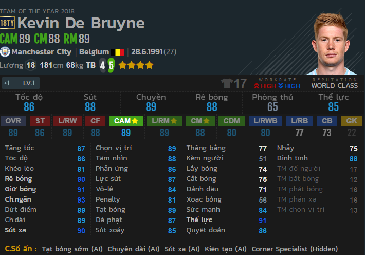 Chỉ số chuyển của Bruyne phần nào phản ánh được khả năng chuyền bóng xuất sắc của cầu thủ này. Cho dù là chuyền ngắn hay chuyền dài, Bruyne vẫn hoàn thành xuất sắc các đường chuyền với độ chính xác cực kì cao. Khả năng chọc khe cũng là điểm mạnh của Bruyne khi bóng đi nhanh, hướng đi thuận lợi với hướng chạy của cầu thủ.Bruyne tạt bóng cũng rất tốt,bóng tốc độ nhanh và có tỉ lệ chính xác cao. Tuy nhiên độ cong của những cú tạt lại không nhiều khiến đôi lúc vẫn có thể bị cản phá bởi hậu vệ hoặc thủ môn.