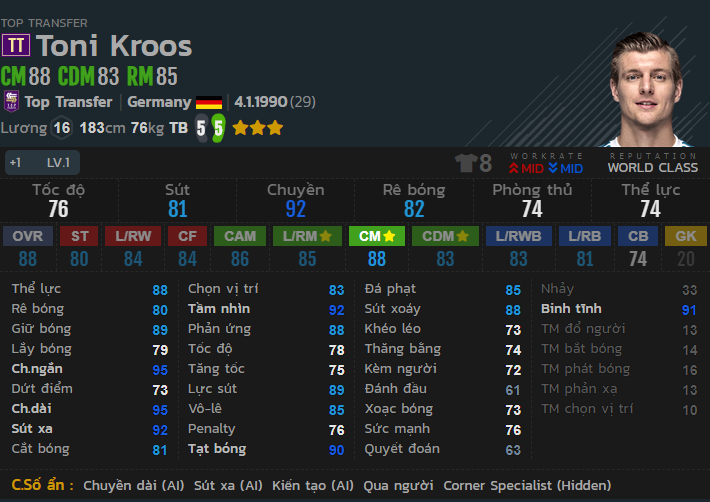 Là một trong những tiền vệ xuất sắc nhất thời điểm hiện tại vậy nên không quá bất ngờ khi Kroos được xếp hạng rất cao như vậy. Khả năng chuyền ngắn lần chuyền dài bóng sệt của Kroos gần như không có gì phải bàn cãi. Tuy nhiên có một điểm mạnh thực sự đó là khả năng chọc khe bổng. Bóng đi nhanh, chính xác và có điểm rơi gần như hoàn hảo và vô cùng thuận lợi với hướng chạy và tư thế đỡ bóng của đồng đội. Với những bạn chơi lối đá chọc khe bổng thì đây chính là quân bài lợi hại bậc nhất trong đội hình mà bạn nên sở hữu. Khả năng tạt bóng của Kroos cũng là rất tốt, bóng đi chính xác và luôn vào tư thế thuận lợi cho đồng đội.