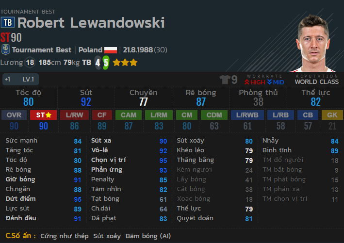 Vốn sút tốt cả 2 chân, đường bóng đi mạnh, hiểm và khó bắt nhưng Lewandowski không được đánh giá quá cao trong top 20. Đôi lúc vẫn có sự thiếu ổn định trong những cú sút, ngoài ra mặc dù có thể hình tốt nhưng Lewandowski đánh đầu không ổn, khả năng bật nhảy không quá tốt và dễ bị trung vệ đối phương đè và tranh chấp.. Khả năng bắt bóng sống của Lewandowski ở mức ổn. Cùng với đó khả năng sút xoáy của Lewandowski cũng ở mức vừa phải.