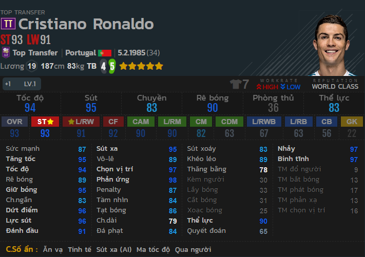 Vốn dĩ là một trong những cầu thủ toàn diện bậc nhất, chỉ số cũng được xếp vào hàng nhất nhì trong game tuy nhiên CR7 lại không được các game thủ hàn quốc đánh giá cao ở vị trí trung phong. Lý do là ở khả năng di chuyển không bóng của Ronaldo đôi lúc không tốt nếu có quá động hậu vệ. Dứt điểm tốt, lực sút căng chính là điểm mạnh của CR7 vì bóng đi hiểm, mạnh khiến thủ môn không kịp phản xạ. Chỉ số đánh đầu tốt, khả năng bật nhảy tốt nhưng CR7 không thực sự mạnh trong không chiến, lực đánh đầu và khả năng điều hướng bóng là hơi phập phù, dễ bị trung vệ đối phương tì đè để tranh chấp bóng bổng. Thăng bằng không cao cũng khiến CR7 khó sút tốt khi bị tì đè hoặc tác động của đối phương..