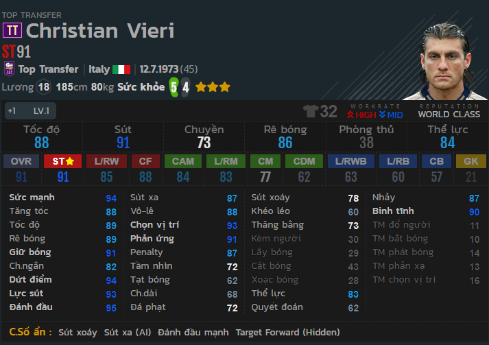 Mạnh về không chiến khi mà khả năng tranh chấp bóng bổng để đánh đầu của Vieri là rất tốt, với đánh đầu mạnh,lực đánh đầu của Vieri là vô cùng hiểm và khó có thể bị cản phá. Tuy nhiên điểm trừ lớn nhất của cầu thủ này là chân không thuận rất tệ. Mặc dù tới 4 sao chân không thuận nhưng Vieri dứt điểm chân phải rất tù, bóng đi không chính xác và khá phập phù. Ngược lại chân phải lại vô cùng mạnh mẽ, chính xác và khó bị cản phá. Khả năng dứt điểm 1 chạm cũng chỉ tốt với chân trái, còn chân phải thì bóng đi yếu, dễ lệch và khó kiểm soát hướng bóng. Khả năng sút xoáy tầm trung của Vieri cũng chỉ tốt với chân thuận, chân không thuận bóng đi hay bị lệch, không cong và thường bị đẩy bởi thủ môn.