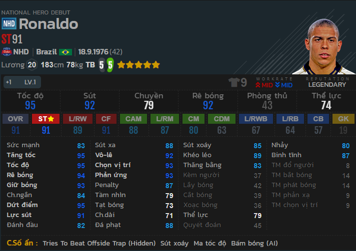 Sau những trải nghiệm của nhiều game thủ VN thì đều có thể thấy được khả năng dứt điểm của Rô béo là cực kì tốt. Sút chéo góc, sút thẳng hay dứt điểm 1 chạm Ronaldo đều hoàn thành xuất sắc nhiệm vụ của mình. Khả năng không chiến của Ronaldo dừng ở mức ổn dù không có sự nổi trội nhưng có độ ổn định cao khi khả năng chọn vị trí và bật nhảy của Rô béo là khá tốt. Sút xoáy tầm trung của Rô béo cũng rất tốt và có độ ổn định cao.